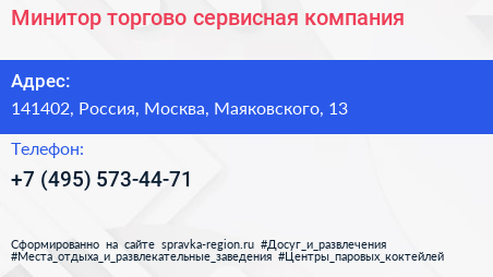 Минитор, торгово-сервисная компания по адресу 141402, Россия, Москва, Маяковского, 13 в дальнейшем Организация, размещена в следующих категориях: