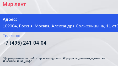 Мир лент по адресу 109004, Россия, Москва, Александра Солженицына, 11 ст3 в дальнейшем Организация, размещена в следующих категориях: