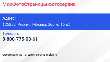 МоиФотоСтраницы, фотосервис по адресу 125252, Россия, Москва, Зорге, 15 к1 в дальнейшем Организация, размещена в следующих категориях: