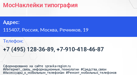 МосНаклейки, типография по адресу 115407, Россия, Москва, Речников, 19 в дальнейшем Организация, размещена в следующих категориях: