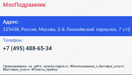 МосПодрамник по адресу 125438, Россия, Москва, 2-й Лихачёвский переулок, 7 ст2 в дальнейшем Организация, размещена в следующих категориях: