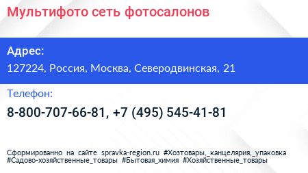 Мультифото, сеть фотосалонов по адресу 127224, Россия, Москва, Северодвинская, 21 в дальнейшем Организация, размещена в следующих категориях: