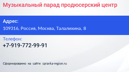 Музыкальный парад, продюсерский центр по адресу 109316, Россия, Москва, Талалихина, 8 в дальнейшем Организация, размещена в следующих категориях: