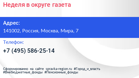 Неделя в округе, газета по адресу 141002, Россия, Москва, Мира, 7 в дальнейшем Организация, размещена в следующих категориях: