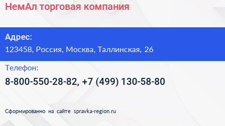 НемАл, торговая компания по адресу 123458, Россия, Москва, Таллинская, 26 в дальнейшем Организация, размещена в следующих категориях: