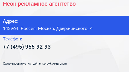 Неон, рекламное агентство по адресу 143964, Россия, Москва, Дзержинского, 4 в дальнейшем Организация, размещена в следующих категориях: