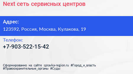 Next, сеть сервисных центров по адресу 123592, Россия, Москва, Кулакова, 19 в дальнейшем Организация, размещена в следующих категориях: