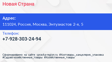 Новая Страна по адресу 111024, Россия, Москва, Энтузиастов 2-я, 5 в дальнейшем Организация, размещена в следующих категориях:
