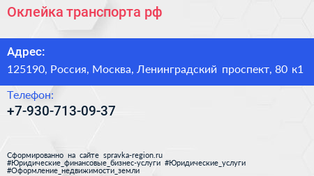 Оклейка-транспорта.рф по адресу 125190, Россия, Москва, Ленинградский проспект, 80 к1 в дальнейшем Организация, размещена в следующих категориях: