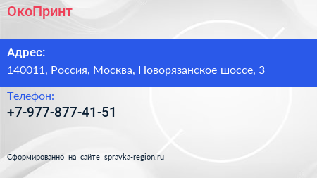 ОкоПринт по адресу 140011, Россия, Москва, Новорязанское шоссе, 3 в дальнейшем Организация, размещена в следующих категориях: