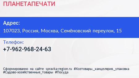ПЛАНЕТАПЕЧАТИ по адресу 107023, Россия, Москва, Семёновский переулок, 15 в дальнейшем Организация, размещена в следующих категориях: