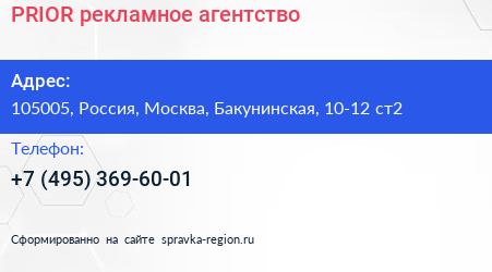 PRIOR, рекламное агентство по адресу 105005, Россия, Москва, Бакунинская, 10-12 ст2 в дальнейшем Организация, размещена в следующих категориях: