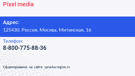 Pixel-media по адресу 125430, Россия, Москва, Митинская, 16 в дальнейшем Организация, размещена в следующих категориях:
