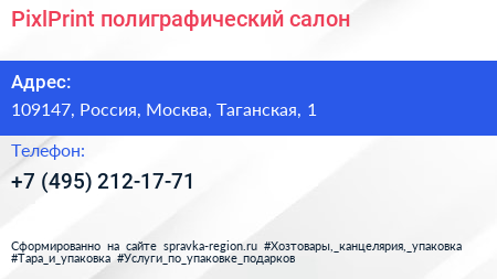 PixlPrint, полиграфический салон по адресу 109147, Россия, Москва, Таганская, 1 в дальнейшем Организация, размещена в следующих категориях: