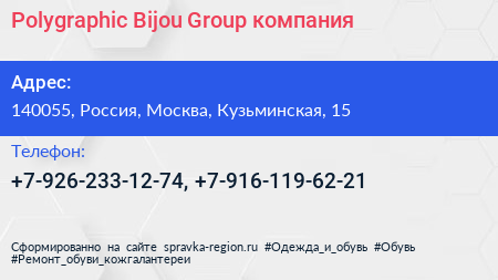 Polygraphic Bijou Group, компания по адресу 140055, Россия, Москва, Кузьминская, 15 в дальнейшем Организация, размещена в следующих категориях: