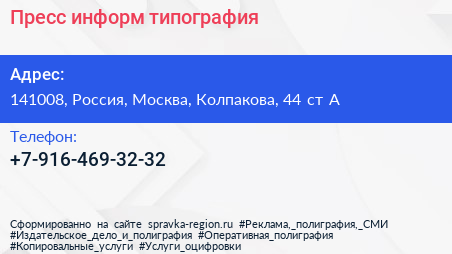 Пресс-информ, типография по адресу 141008, Россия, Москва, Колпакова, 44 ст А в дальнейшем Организация, размещена в следующих категориях: