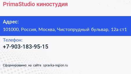 PrimaStudio, киностудия по адресу 101000, Россия, Москва, Чистопрудный бульвар, 12а ст1 в дальнейшем Организация, размещена в следующих категориях: