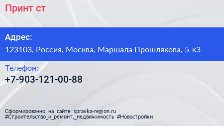 Принт-ст по адресу 123103, Россия, Москва, Маршала Прошлякова, 5 к3 в дальнейшем Организация, размещена в следующих категориях: