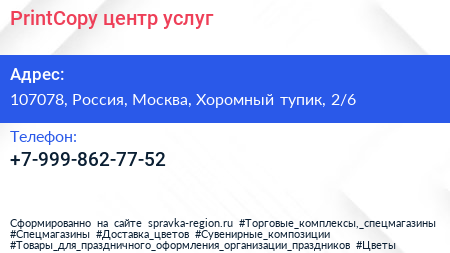 PrintCopy, центр услуг по адресу 107078, Россия, Москва, Хоромный тупик, 2/6 в дальнейшем Организация, размещена в следующих категориях: