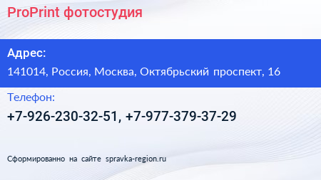 ProPrint, фотостудия по адресу 141014, Россия, Москва, Октябрьский проспект, 16 в дальнейшем Организация, размещена в следующих категориях: