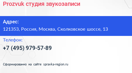 Prozvuk, студия звукозаписи по адресу 121353, Россия, Москва, Сколковское шоссе, 13 в дальнейшем Организация, размещена в следующих категориях: