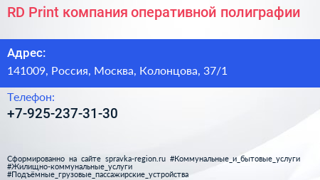 RD Print, компания оперативной полиграфии по адресу 141009, Россия, Москва, Колонцова, 37/1 в дальнейшем Организация, размещена в следующих категориях: