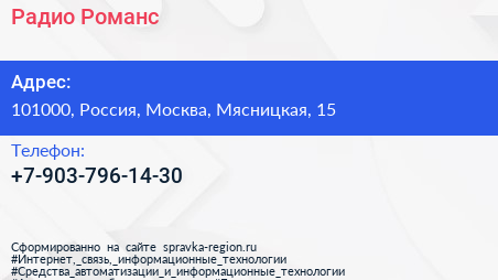 Радио Романс по адресу 101000, Россия, Москва, Мясницкая, 15 в дальнейшем Организация, размещена в следующих категориях: