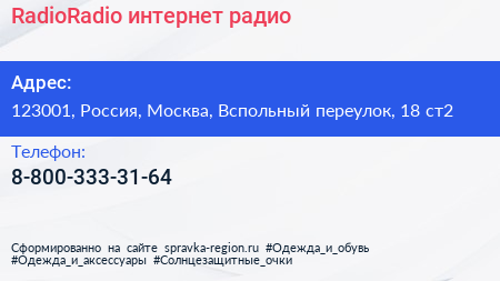 RadioRadio, интернет-радио по адресу 123001, Россия, Москва, Вспольный переулок, 18 ст2 в дальнейшем Организация, размещена в следующих категориях: