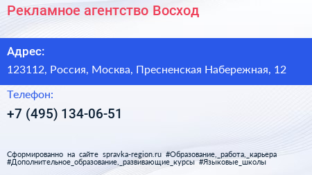 Рекламное агентство Восход по адресу 123112, Россия, Москва, Пресненская Набережная, 12 в дальнейшем Организация, размещена в следующих категориях: