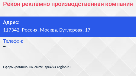 Рекон, рекламно-производственная компания по адресу 117342, Россия, Москва, Бутлерова, 17 в дальнейшем Организация, размещена в следующих категориях: