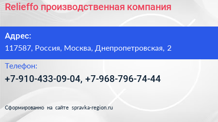 Relieffo, производственная компания по адресу 117587, Россия, Москва, Днепропетровская, 2 в дальнейшем Организация, размещена в следующих категориях:
