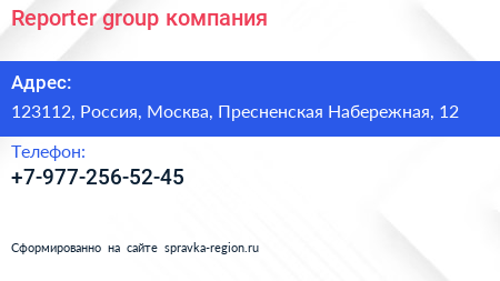 Reporter-group, компания по адресу 123112, Россия, Москва, Пресненская Набережная, 12 в дальнейшем Организация, размещена в следующих категориях: