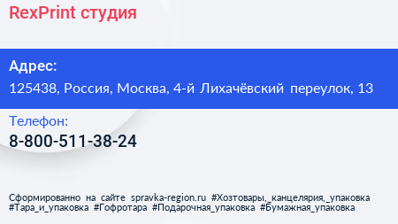 RexPrint, студия по адресу 125438, Россия, Москва, 4-й Лихачёвский переулок, 13 в дальнейшем Организация, размещена в следующих категориях: