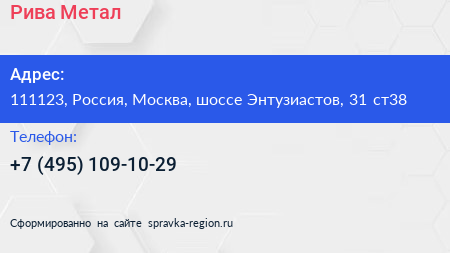 Рива Метал по адресу 111123, Россия, Москва, шоссе Энтузиастов, 31 ст38 в дальнейшем Организация, размещена в следующих категориях: