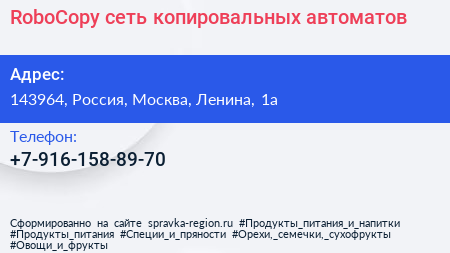 RoboCopy, сеть копировальных автоматов по адресу 143964, Россия, Москва, Ленина, 1а в дальнейшем Организация, размещена в следующих категориях: