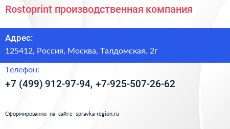 Rostoprint, производственная компания по адресу 125412, Россия, Москва, Талдомская, 2г в дальнейшем Организация, размещена в следующих категориях: