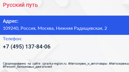 Русский путь по адресу 109240, Россия, Москва, Нижняя Радищевская, 2 в дальнейшем Организация, размещена в следующих категориях: