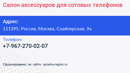 Салон аксессуаров для сотовых телефонов по адресу 111395, Россия, Москва, Снайперская, 9а в дальнейшем Организация, размещена в следующих категориях:
