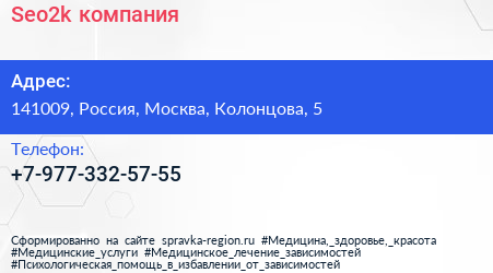 Seo2k, компания по адресу 141009, Россия, Москва, Колонцова, 5 в дальнейшем Организация, размещена в следующих категориях: