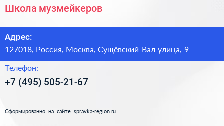 Школа музмейкеров по адресу 127018, Россия, Москва, Сущёвский Вал улица, 9 в дальнейшем Организация, размещена в следующих категориях: