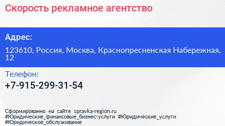 Скорость, рекламное агентство по адресу 123610, Россия, Москва, Краснопресненская Набережная, 12 в дальнейшем Организация, размещена в следующих категориях: