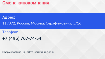 Смена, кинокомпания по адресу 119072, Россия, Москва, Серафимовича, 5/16 в дальнейшем Организация, размещена в следующих категориях: