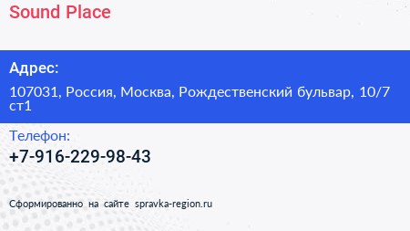 Sound Place по адресу 107031, Россия, Москва, Рождественский бульвар, 10/7 ст1 в дальнейшем Организация, размещена в следующих категориях: