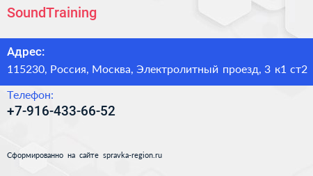 SoundTraining по адресу 115230, Россия, Москва, Электролитный проезд, 3 к1 ст2 в дальнейшем Организация, размещена в следующих категориях: