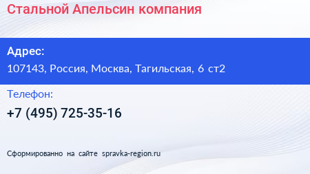 Стальной Апельсин, компания по адресу 107143, Россия, Москва, Тагильская, 6 ст2 в дальнейшем Организация, размещена в следующих категориях: