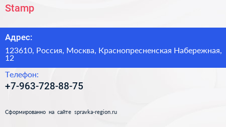 Stamp по адресу 123610, Россия, Москва, Краснопресненская Набережная, 12 в дальнейшем Организация, размещена в следующих категориях: