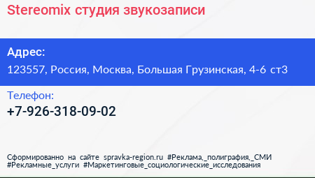 Stereomix, студия звукозаписи по адресу 123557, Россия, Москва, Большая Грузинская, 4-6 ст3 в дальнейшем Организация, размещена в следующих категориях: