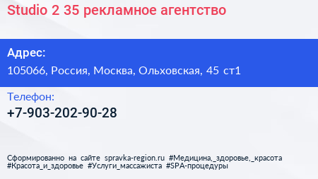 Studio 2.35, рекламное агентство по адресу 105066, Россия, Москва, Ольховская, 45 ст1 в дальнейшем Организация, размещена в следующих категориях: