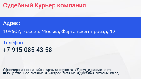 Судебный Курьер, компания по адресу 109507, Россия, Москва, Ферганский проезд, 12 в дальнейшем Организация, размещена в следующих категориях: