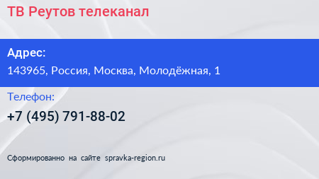 ТВ-Реутов, телеканал по адресу 143965, Россия, Москва, Молодёжная, 1 в дальнейшем Организация, размещена в следующих категориях: